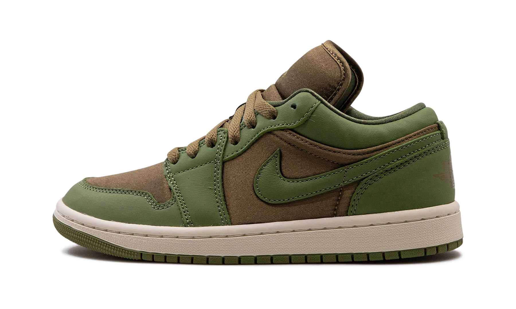 The Jordan 1 Low SE Brown Kelp Sky J Light Olive (Women's) is a low-top shoe in women’s sizing whose colorway was inspired by beef and broccoli.